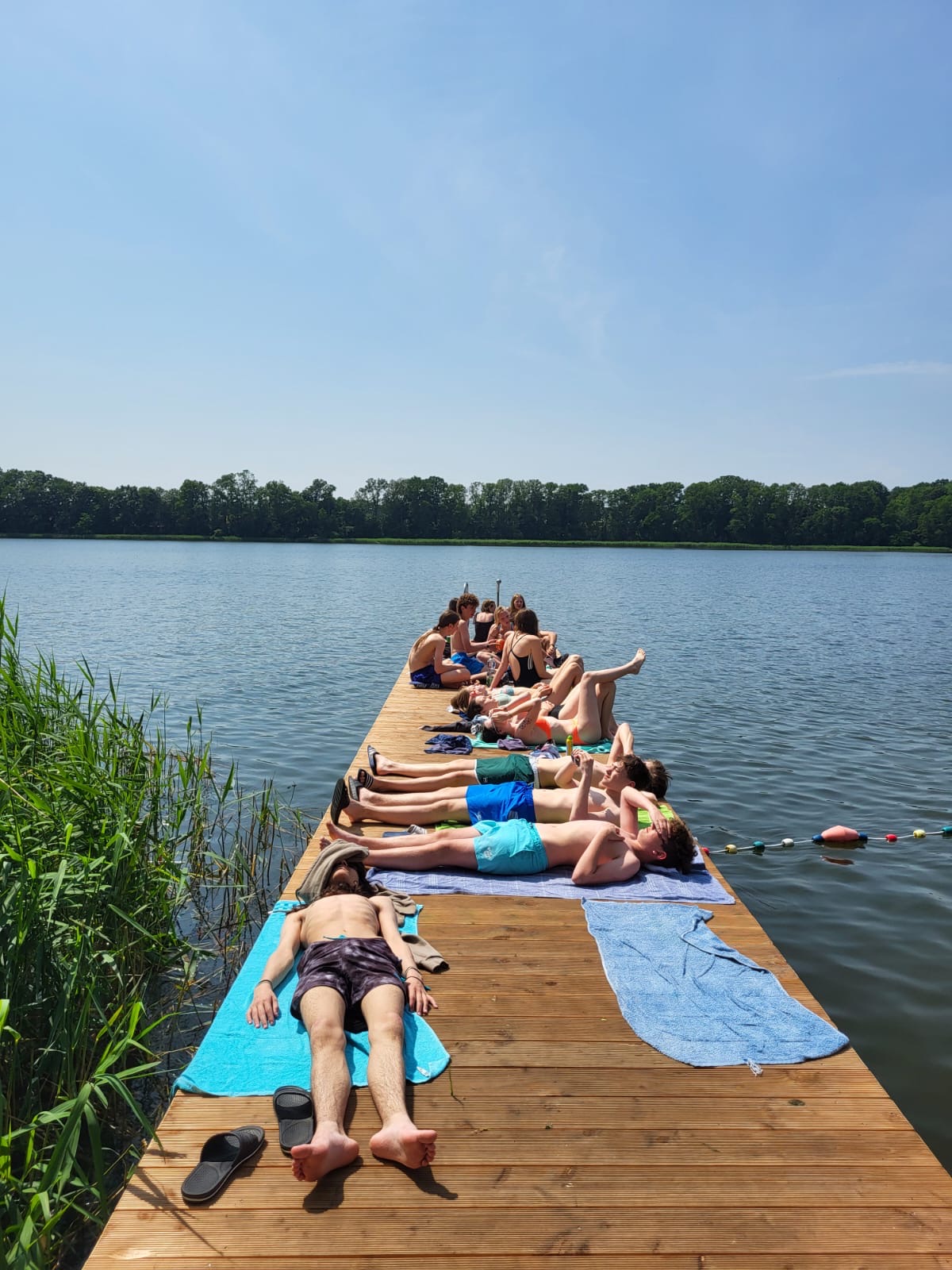 Anschließend durften wir unsere Zimmer beziehen. Dort richteten wir uns ein, packten unsere Sachen aus, bezogen unsere Betten und machten uns ein wenig frisch. Die Unterkunft war zwar einfach, aber gemütlich, und wir fühlten uns sofort wohl. Danach hatten wir Freizeit, um das Gelände besser kennenzulernen. Viele nutzten die Zeit, um sich draußen mit Freunden zu treffen oder einfach mal in Ruhe umzuschauen. Einige spielten gemeinsam Volleyball oder Karten, andere liefen herum, unterhielten sich oder entspannten in der Sonne. Besonders beliebt war natürlich auch der See – dort gingen einige sogar schon am ersten Tag baden. Die gute Stimmung unter allen war sofort spürbar, und es wurde viel gelacht. Es war schön zu sehen, wie sich alle verstanden und der Zusammenhalt in der Klasse direkt spürbar war.