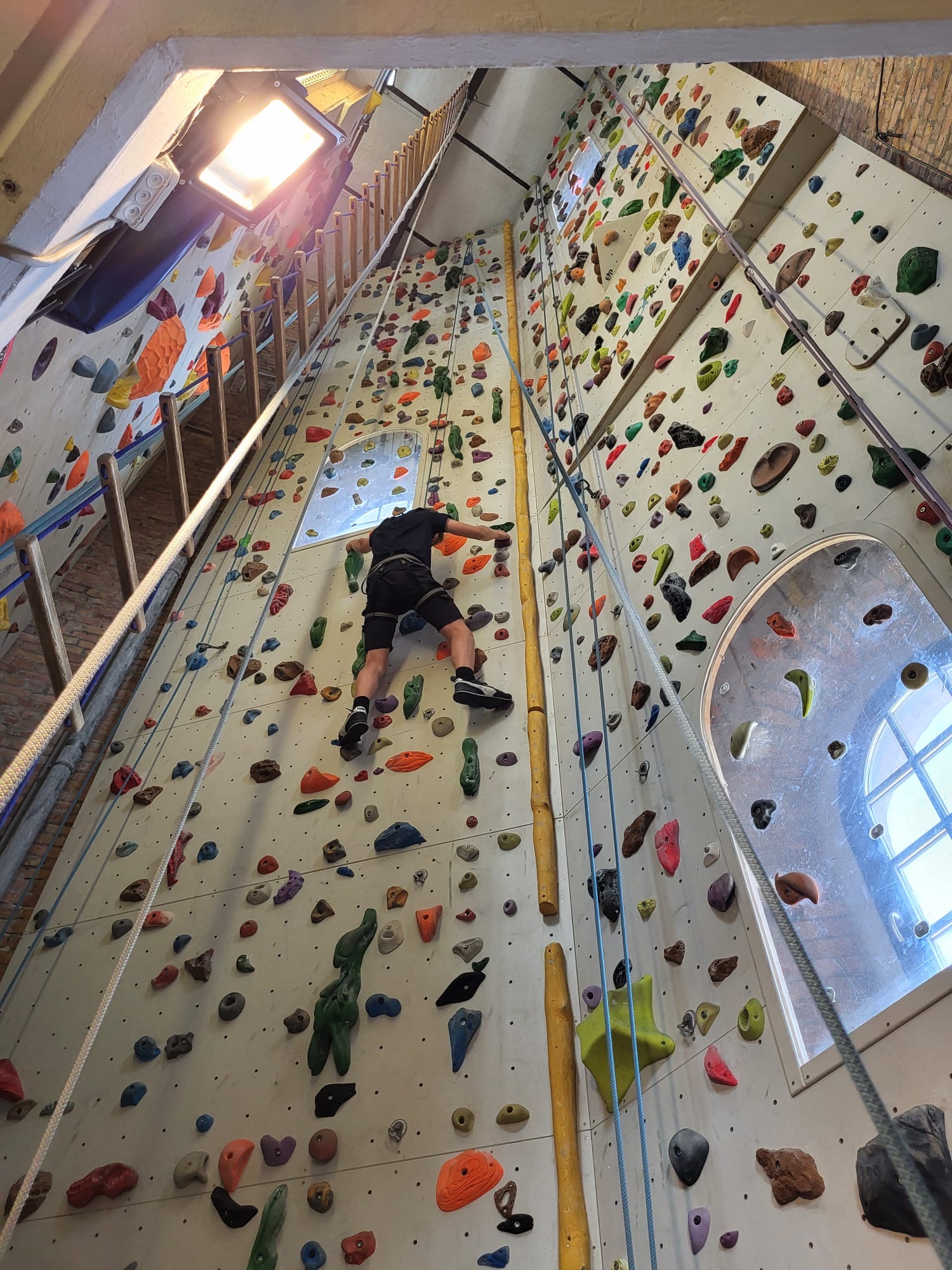 Als wir dort ankamen, wurden wir nach einer kleinen Wartezeit in das Klettern eingewiesen und konnten dann beginnen. Der Turm bot viele unterschiedliche Klettermöglichkeiten an: unter anderem waren dort ein Boulder-Bereich, an dem man ohne Sicherung in geringer Höhe klettern konnte, viele gewöhnliche Kletterwände und eine 15 m lange Hangelleiter, die sehr anspruchsvoll war. Besonders aufregend war der „Klettersteig“, den die meisten von uns mehrmals erfolgreich hinaufstiegen, und für die etwas Mutigeren gab es einen freien Fall von ganz oben, was auch ein echter Nervenkitzel war. Die Herausforderung und der Spaß am Klettern schweißten uns alle als Klasse noch enger zusammen.