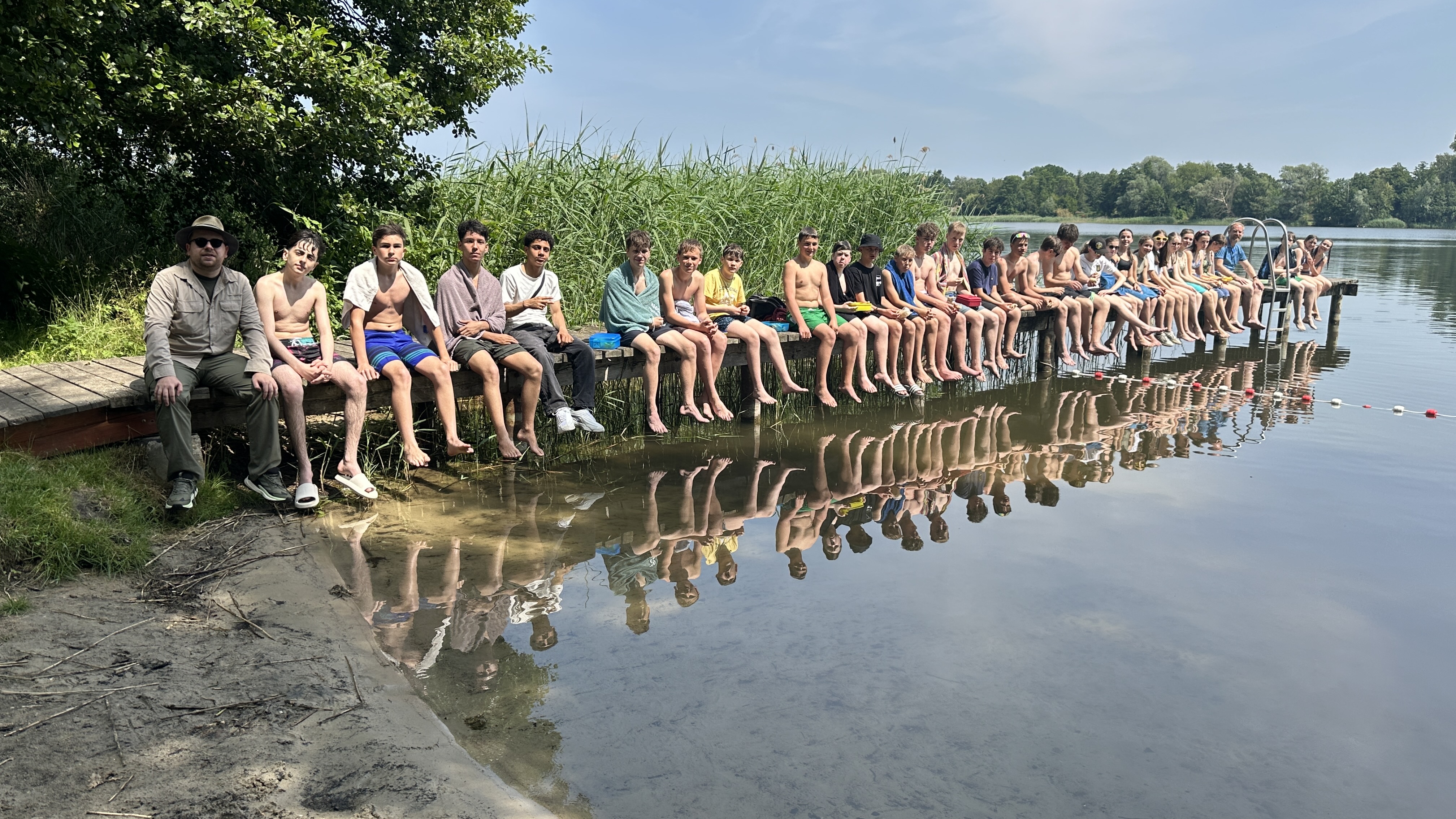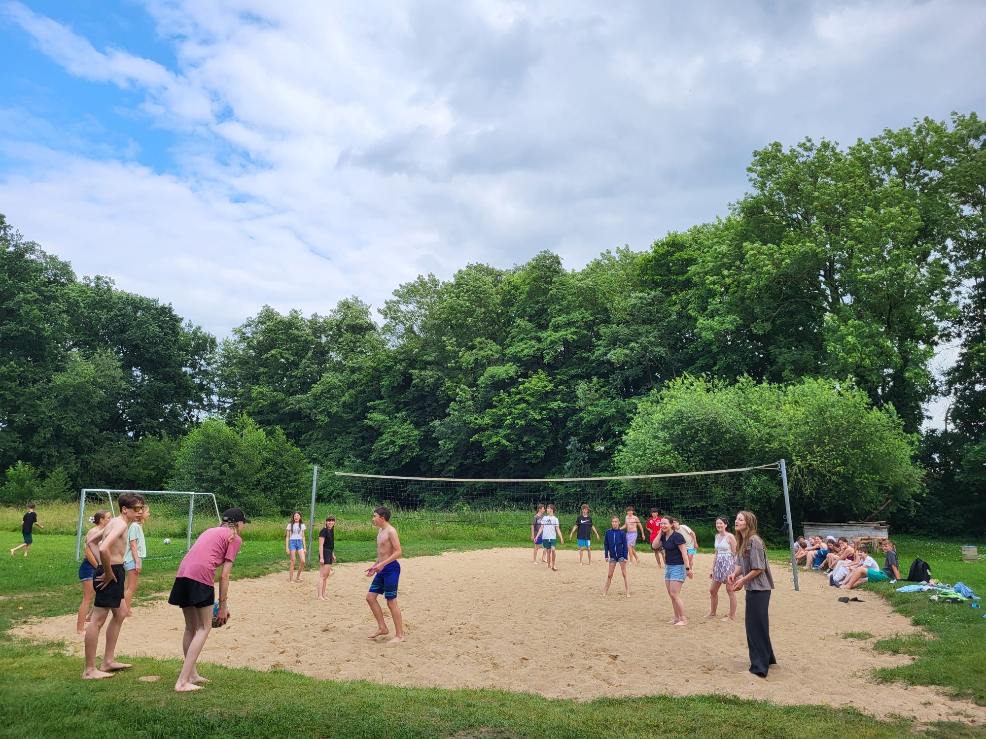 Anschließend durften wir unsere Zimmer beziehen. Dort richteten wir uns ein, packten unsere Sachen aus, bezogen unsere Betten und machten uns ein wenig frisch. Die Unterkunft war zwar einfach, aber gemütlich, und wir fühlten uns sofort wohl. Danach hatten wir Freizeit, um das Gelände besser kennenzulernen. Viele nutzten die Zeit, um sich draußen mit Freunden zu treffen oder einfach mal in Ruhe umzuschauen. Einige spielten gemeinsam Volleyball oder Karten, andere liefen herum, unterhielten sich oder entspannten in der Sonne. Besonders beliebt war natürlich auch der See – dort gingen einige sogar schon am ersten Tag baden. Die gute Stimmung unter allen war sofort spürbar, und es wurde viel gelacht. Es war schön zu sehen, wie sich alle verstanden und der Zusammenhalt in der Klasse direkt spürbar war.