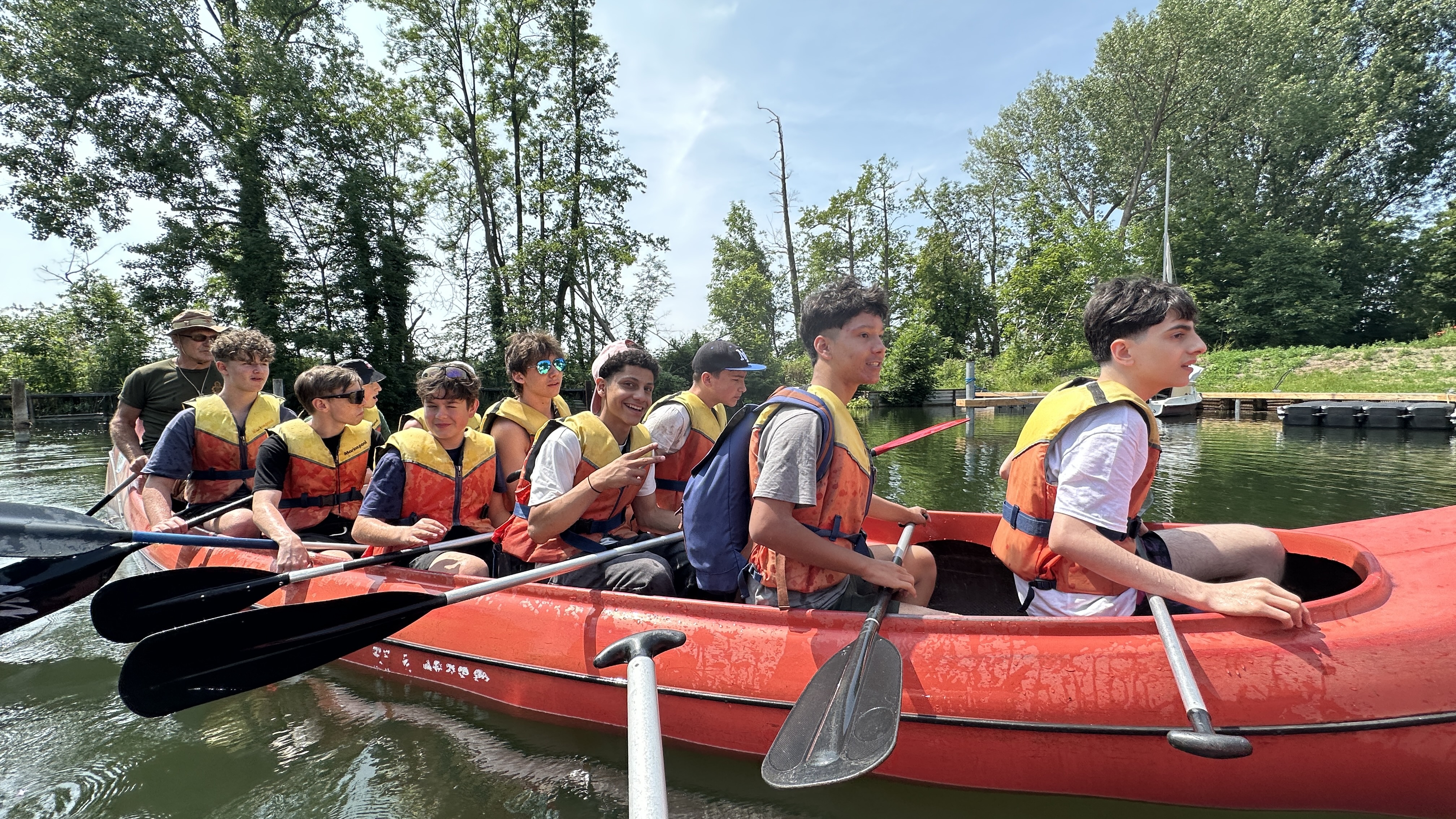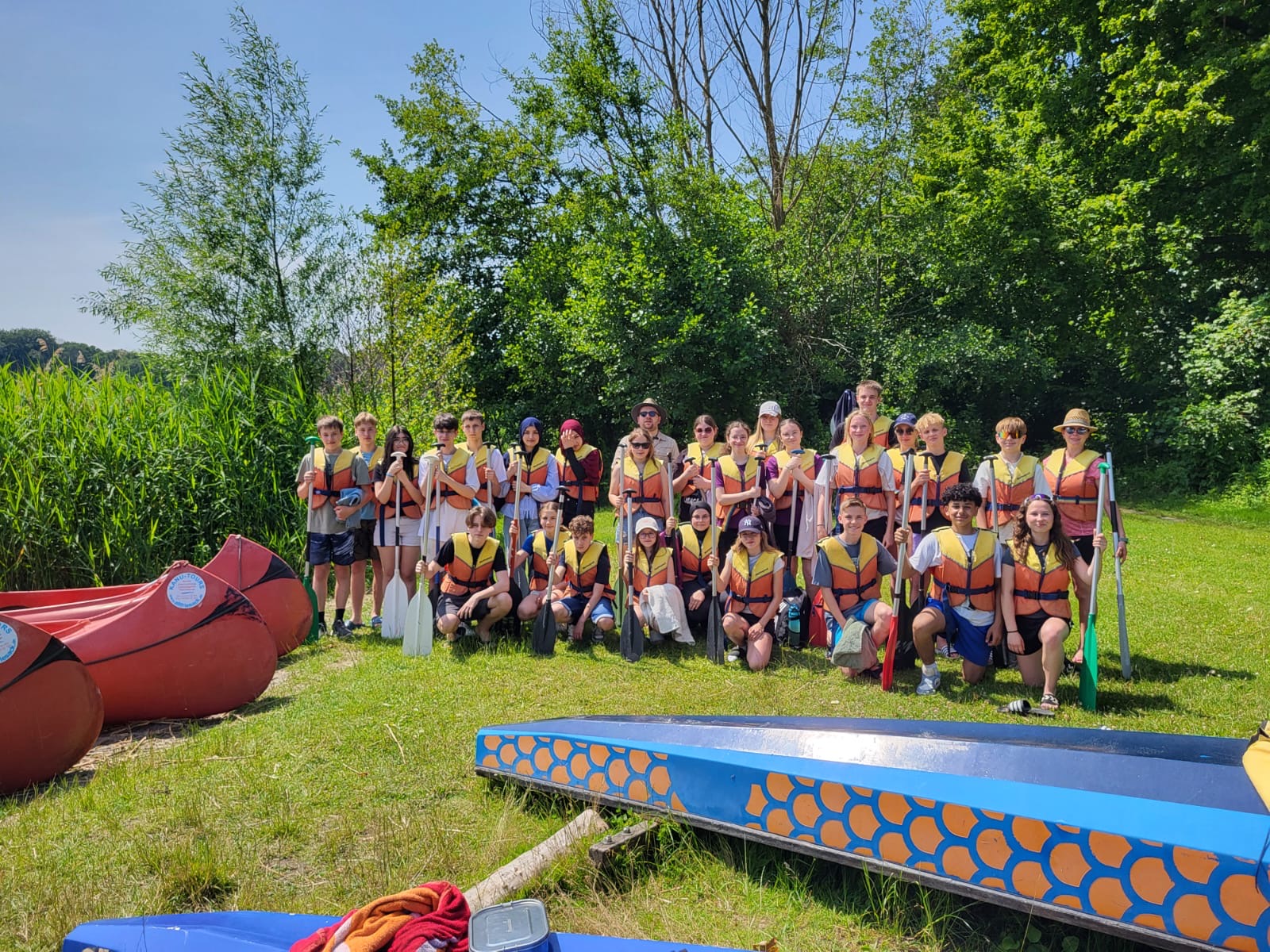 Bei sonnigem Wetter starteten wir in den zweiten Tag unserer Klassenfahrt nach Neuruppin-Gnewikow. Nach einem leckeren Frühstück spielten wir erst einmal eine Runde Volleyball auf dem weitläufigen Gelände des Jugenddorfs. Spaß und gute Laune waren dabei vorprogrammiert. Nachdem wir uns für das Paddeln bereitgemacht hatten, gab uns Fränky, unser Guide, eine kurze Einweisung. Nach kleinen Startschwierigkeiten ging es mit dem Kanadier auf den längsten See Brandenburgs, den Ruppiner See. Fontane beschrieb ihn als Halbmond; wir fanden jedoch, dass er eher wie eine unförmige Wurst aussah. Insgesamt starteten drei Gruppen: eine Jungsgruppe, eine gemischte Gruppe und eine Mädchengruppe. Herr Dziuba und wir, die Mädchengruppe, waren nicht nur die Langsamsten, sondern auch die Unkoordiniertesten. Zur Motivation riefen die anderen Dinge wie „Whoppa“ oder „3-2-1 Paddeln“.