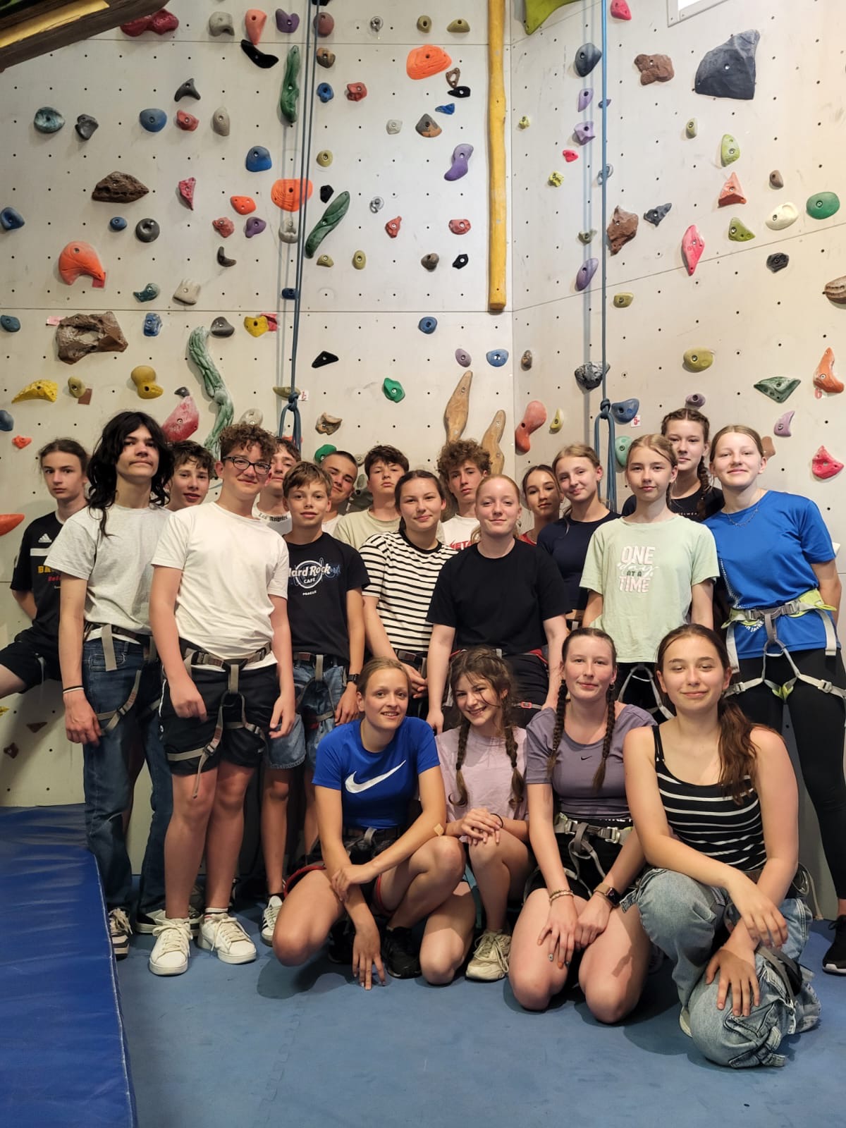 Als wir dort ankamen, wurden wir nach einer kleinen Wartezeit in das Klettern eingewiesen und konnten dann beginnen. Der Turm bot viele unterschiedliche Klettermöglichkeiten an: unter anderem waren dort ein Boulder-Bereich, an dem man ohne Sicherung in geringer Höhe klettern konnte, viele gewöhnliche Kletterwände und eine 15 m lange Hangelleiter, die sehr anspruchsvoll war. Besonders aufregend war der „Klettersteig“, den die meisten von uns mehrmals erfolgreich hinaufstiegen, und für die etwas Mutigeren gab es einen freien Fall von ganz oben, was auch ein echter Nervenkitzel war. Die Herausforderung und der Spaß am Klettern schweißten uns alle als Klasse noch enger zusammen.