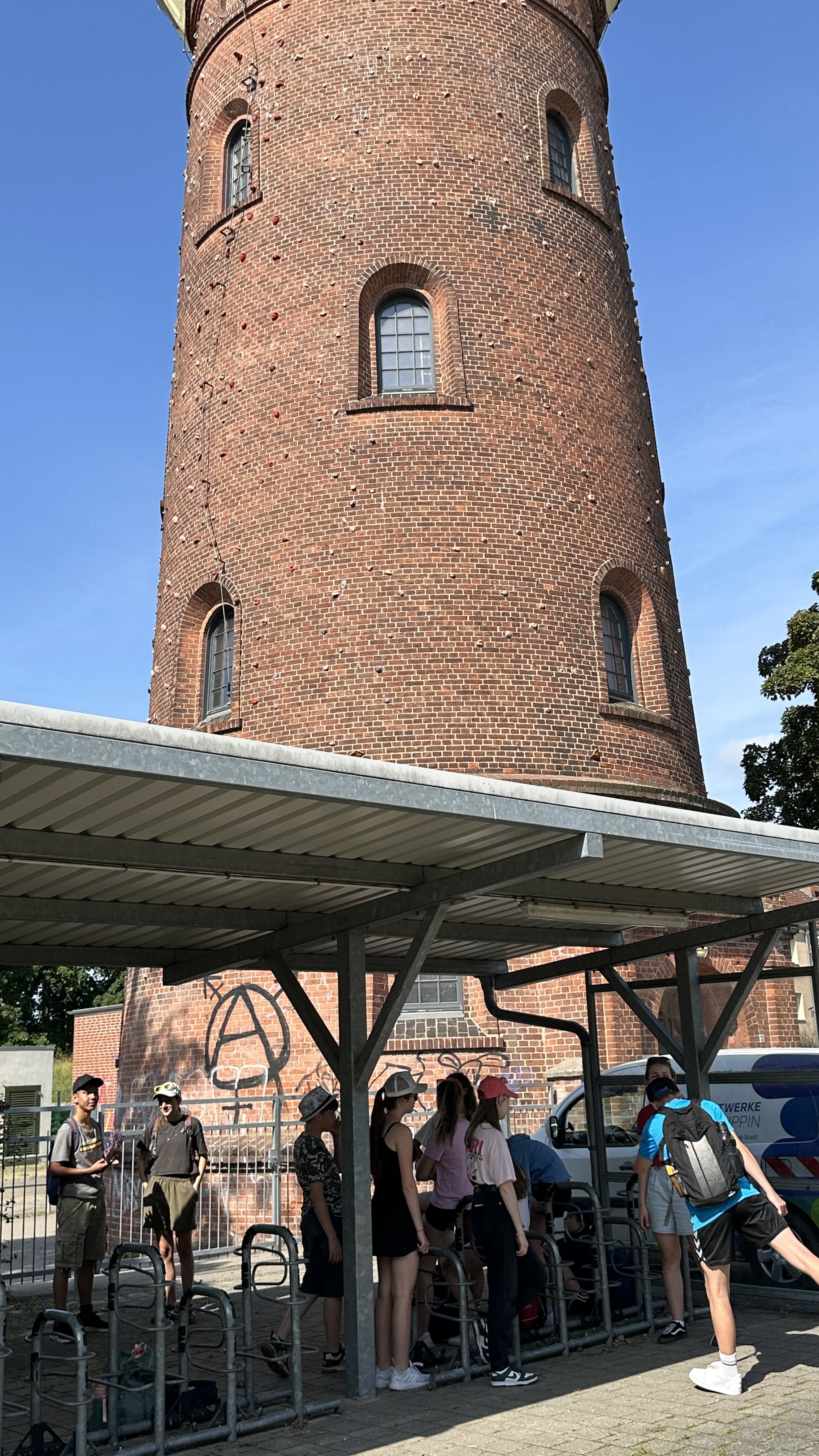Nachdem wir, wie jeden Tag, früh geweckt wurden und danach um 07:15 Uhr gefrühstückt hatten, machte sich unsere Klasse bereit und fuhr mit dem Bus kurz nach 08:30 Uhr los. Viele waren gespannt, was uns an diesem Tag erwarten würde, denn unser Ziel war ein außergewöhnlicher Ort, ein ehemaliger Wasserturm, der heute als Kletterturm genutzt wird.