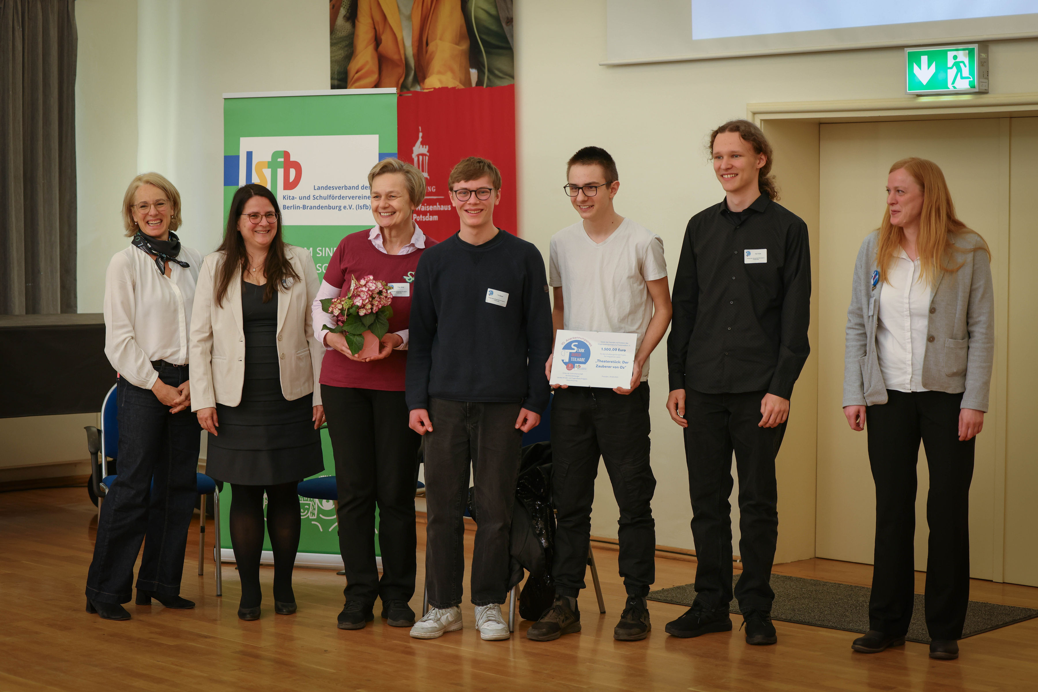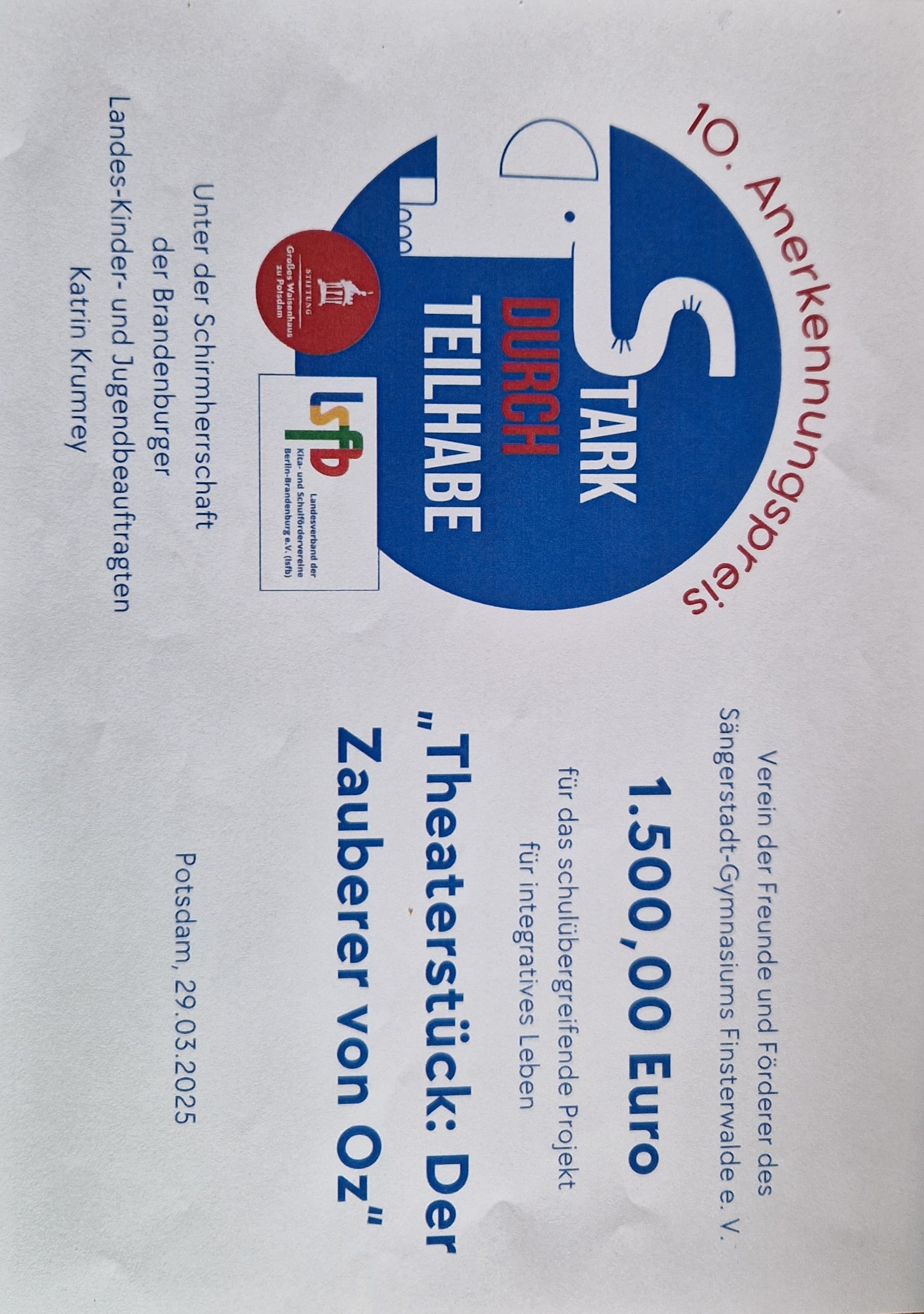 Auf Empfehlung von Sylvia Mäusezahl hatte Frau Seiler sich im Namen des Fördervereins des Sängerstadt-Gymnasiums um den Anerkennungspreis „Stark durch Teilhabe“ 2025 beim Landesverband der Kita- und Schulfördervereine Berlin-Brandenburg e.V. (lsfb) beworben. Dieser Preis würdigt besonders gelungene Projekte an Kitas und Schulen im Land Brandenburg, die Kinder und Jugendliche an Entscheidungsprozessen und Projektumsetzungen aktiv teilhaben lassen, insbesondere junge Menschen, die von Benachteiligungen betroffen sind. Zum zehnten Mal verlieh der lsfb gemeinsam mit der Stiftung Großes Waisenhaus zu Potsdam den Anerkennungspreis “Stark durch Teilhabe”. In diesem Jahr hatte die Jury aus 17 sehr guten Bewerbungen aus dem gesamten Land Brandenburg zu wählen. Der Seminarkurs „Co-Production“ mit dem schulübergreifenden Projekt für integratives Leben begeisterte und überzeugte die Jury.